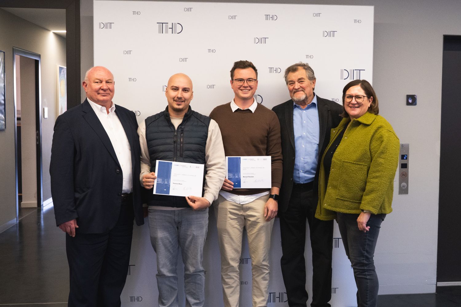 Bild (THD): Die Stipendiaten Manuel Fleischer und Thomas Waas mit der Förderurkunde, Richard Wander von der J. C. Römer Stiftung (2. v.re.), THD-Präsident Prof. Waldemar Berg (links) und Stefanie Möginger vom Career Service.
