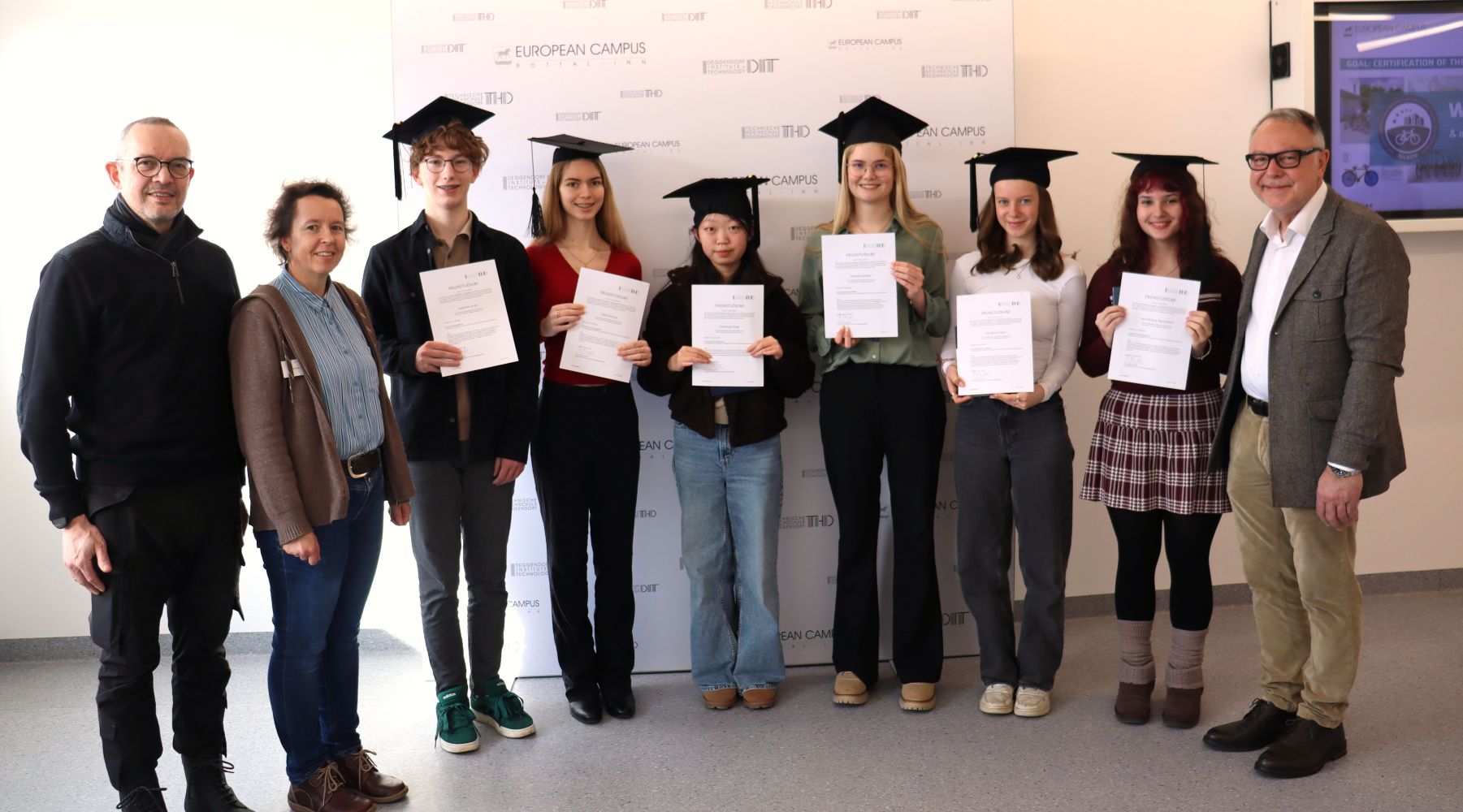 Bild (THD/ECRI): Bei der Übergabe der Zertifikate zum Frühstudium am European Campus Rottal-Inn: (von links) Prodekan Prof. Dr. Sascha Kreiskott, MINT-Organisatorin Andrea Ebertseder, die zertifizierten Gymnasiasten Valentin Gratz, Alina Burner, Canrong Xiong, Karlotta Kreiller, Serafina Urban und Sara-Briana Necsulescu mit Schulleiter Andreas Rohbogner.