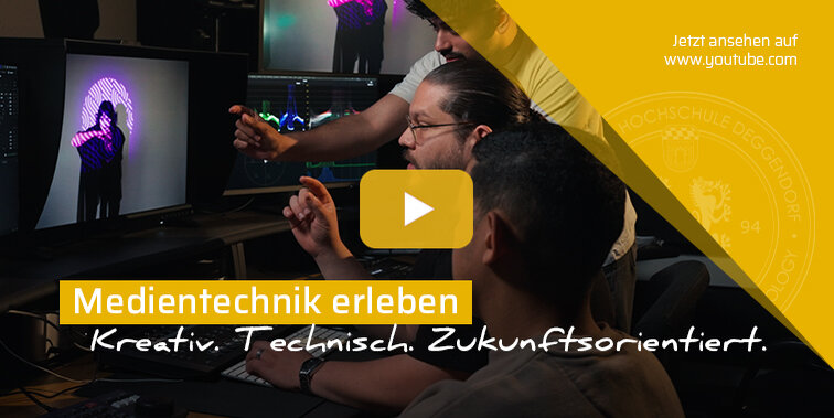 Ob Kameraarbeit, digitale Medienproduktionen, 3D-Visualisierungen, Lichttechnik oder interaktive Echtzeit-XR-Anwendungen: Im Bachelorstudiengang Medientechnik an der Technischen Hochschule Deggendorf bekommst du das technische Rüstzeug und kreative Know-how, um multimediale Inhalte von morgen zu entwickeln und umzusetzen. Marken, Media Experiences, Kommunikationsräume und Lichtdesigns gestalten – du kannst alles machen!